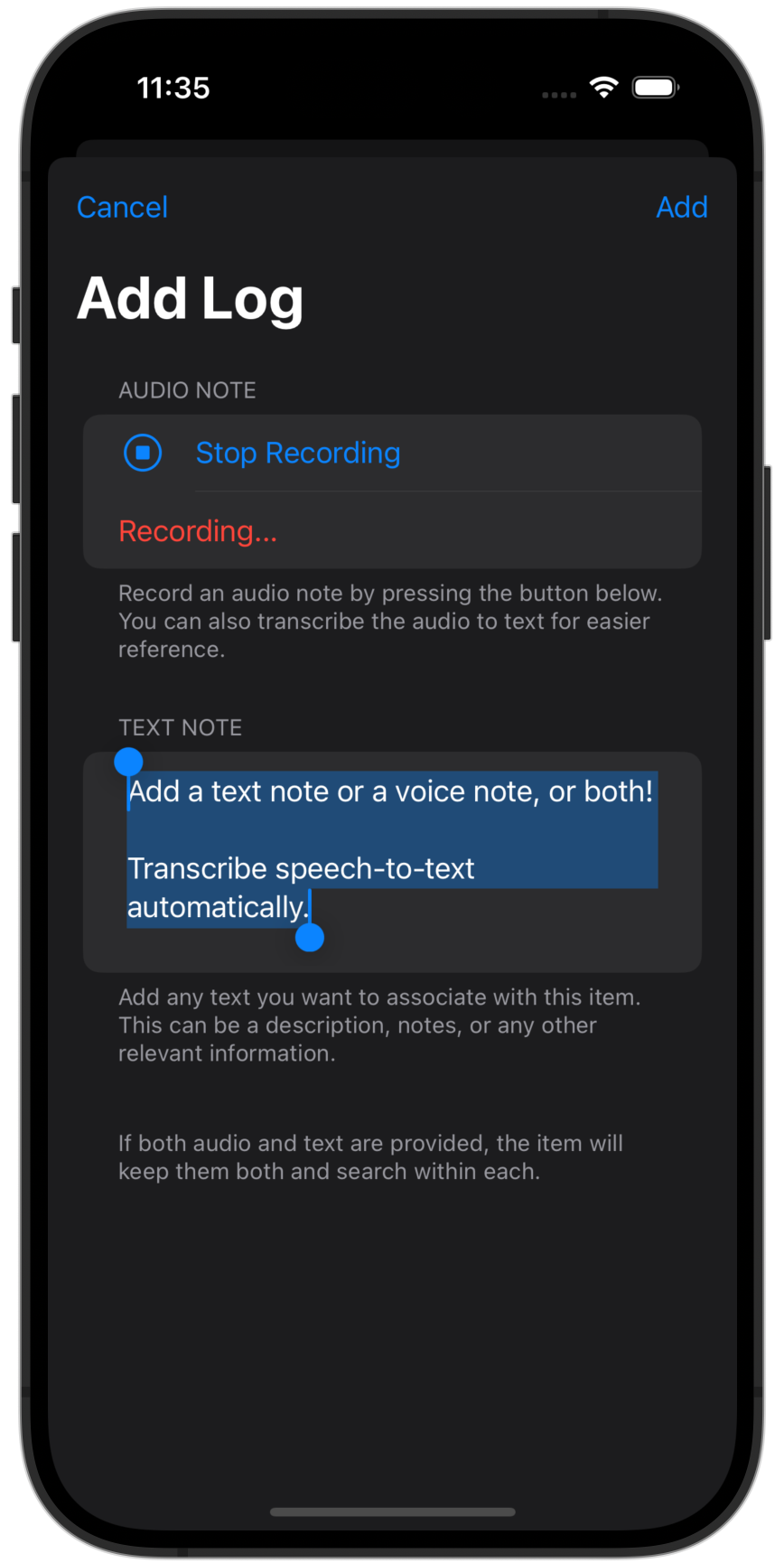 - The voice recording is stored with notes in the app's local storage (Swift Data).