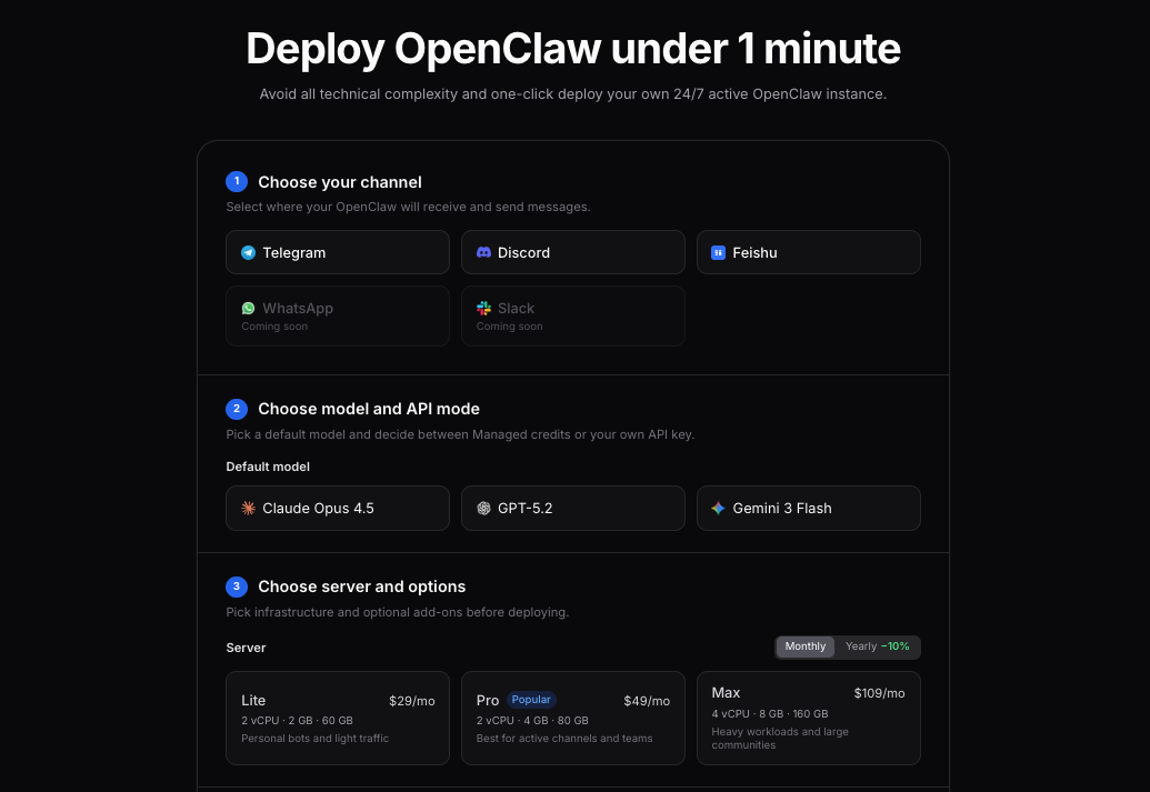 You go through a three-step wizard: pick a plan, connect a messaging channel (Telegram, Discord, or Feishu/Lark), and configure your AI model. That's it. Your bot is live in under two minutes.