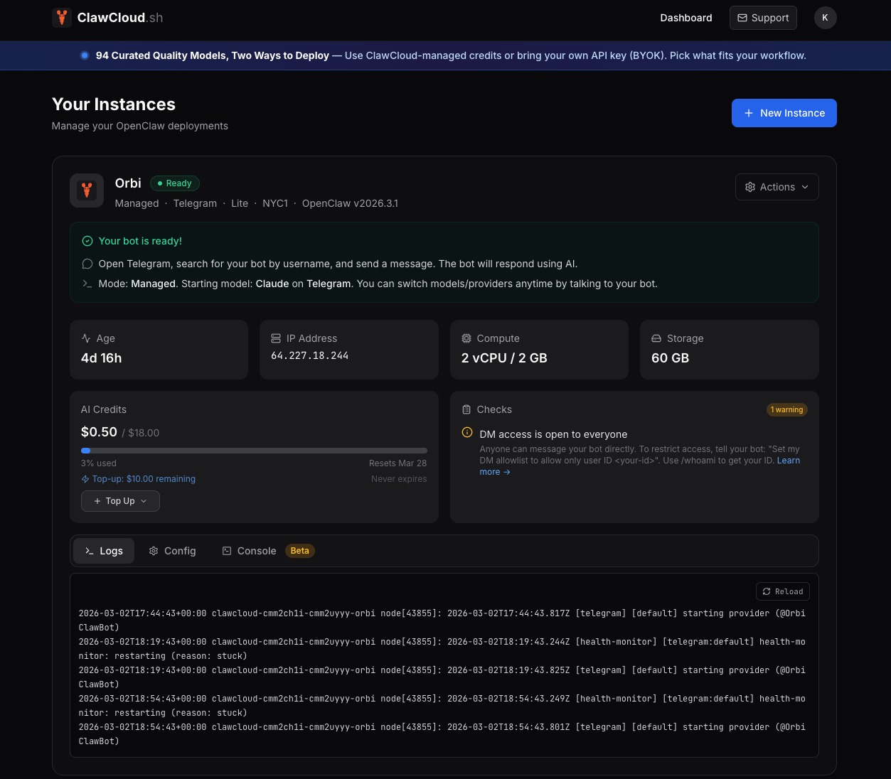 If you've already lost an evening to config issues and want the thing running, or if you want to deploy multiple bots for a team or project without maintaining separate servers, that's exactly what ClawCloud handles.